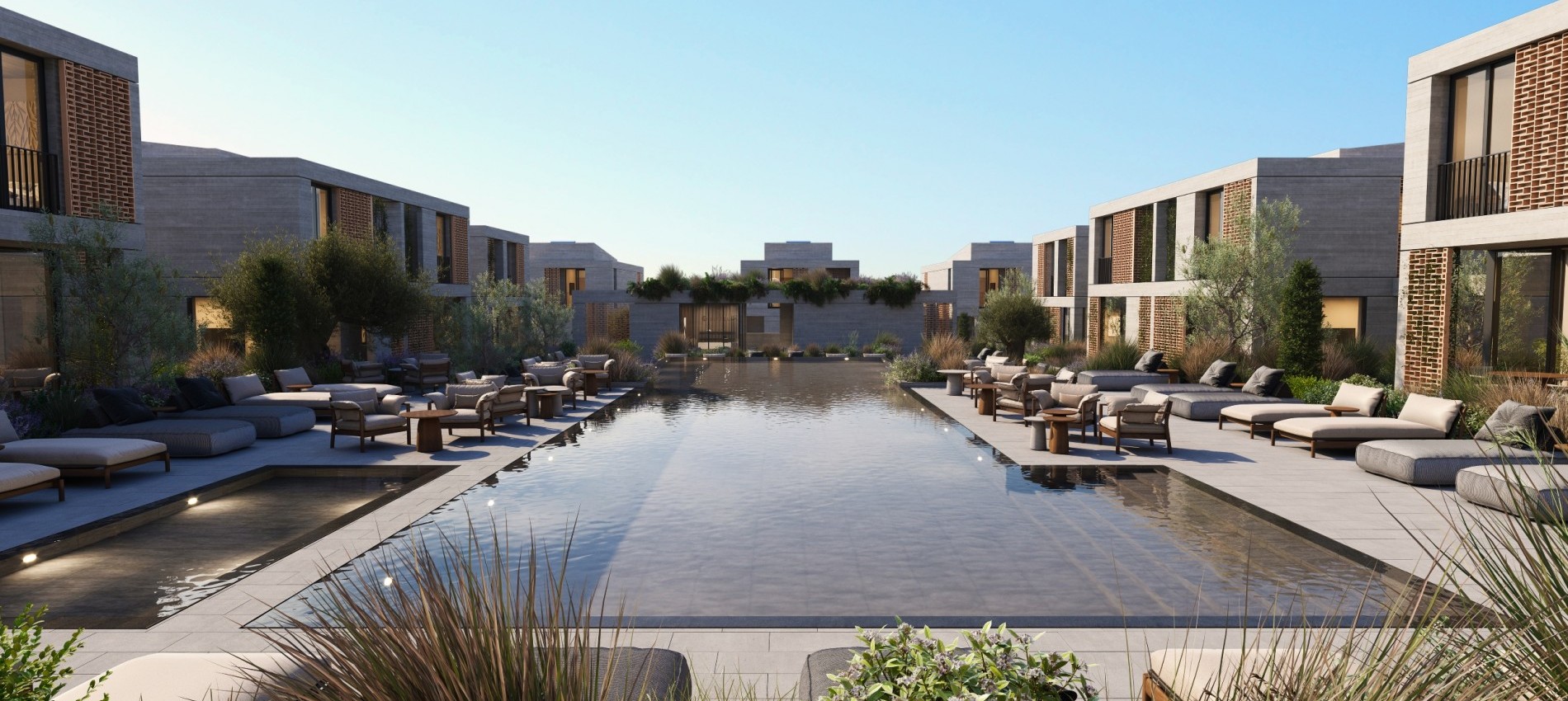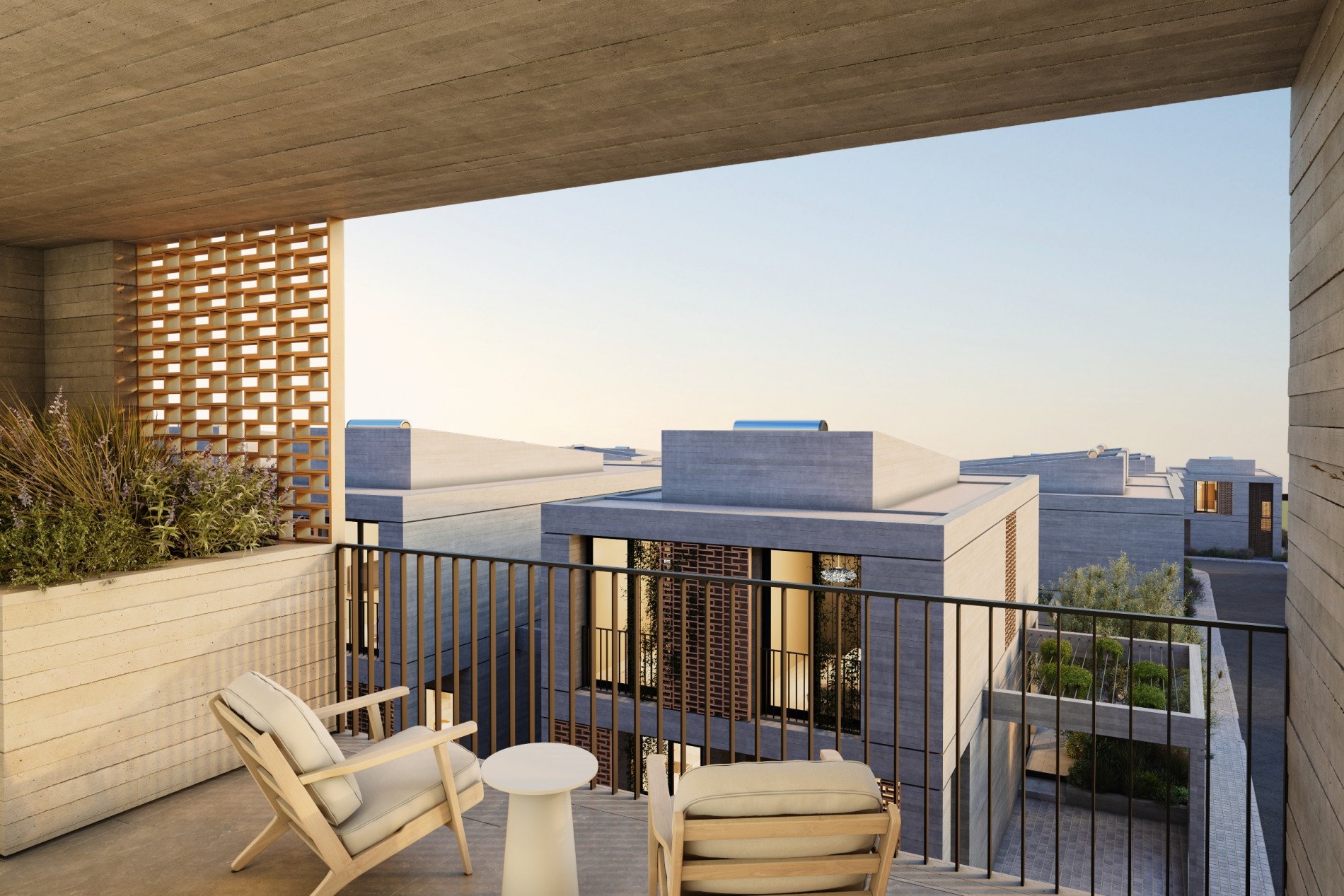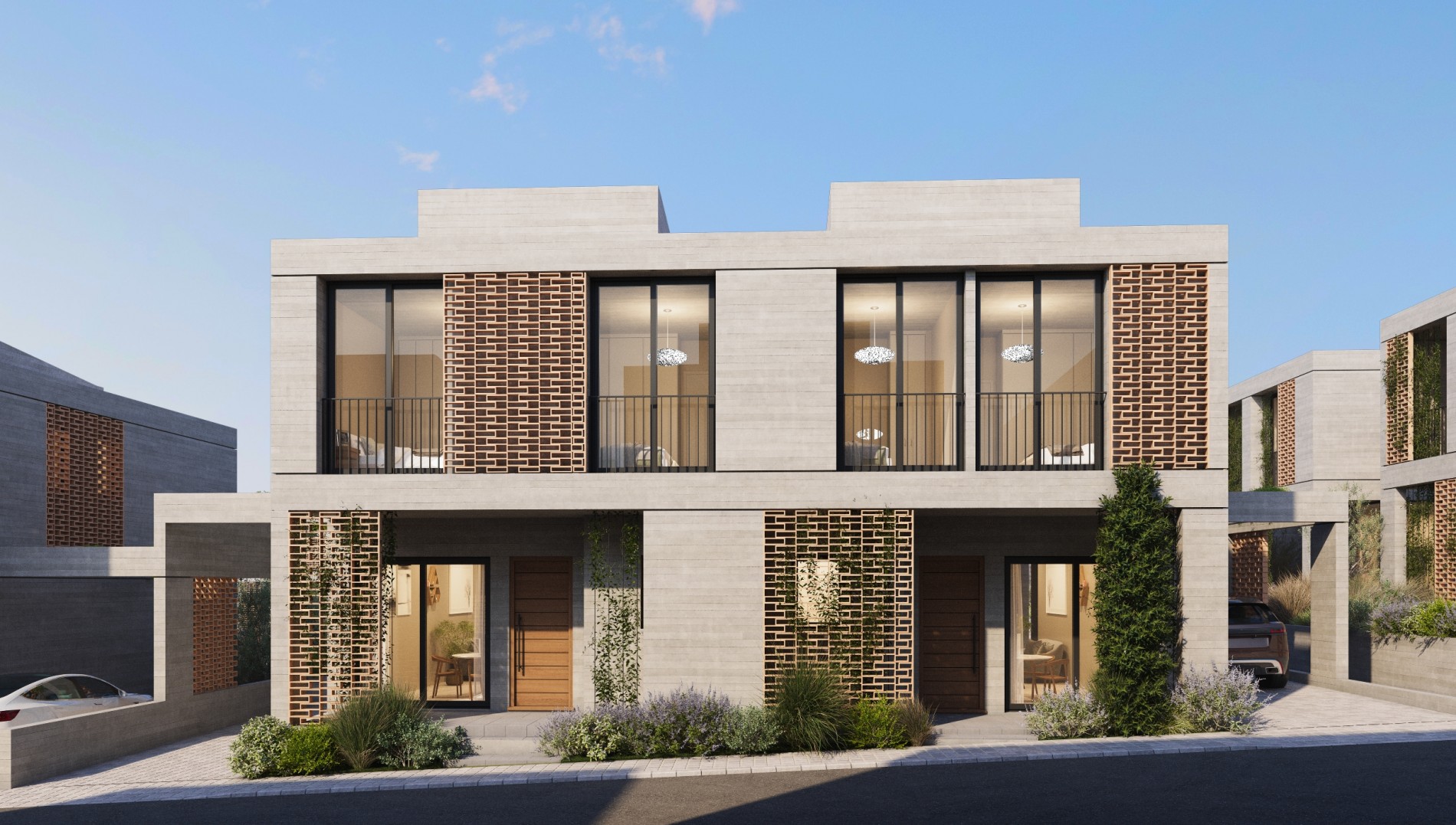 Defined by board formed concrete and sculpted brick screens, Avalon Valley presents a distinctive visual identity. The development consists of 36 modern homes and two identical apartment buildings housing 32 residences including two- bedroom and one-bedroom apartments as well as studios. Seven homes feature the added luxury of a private pool.