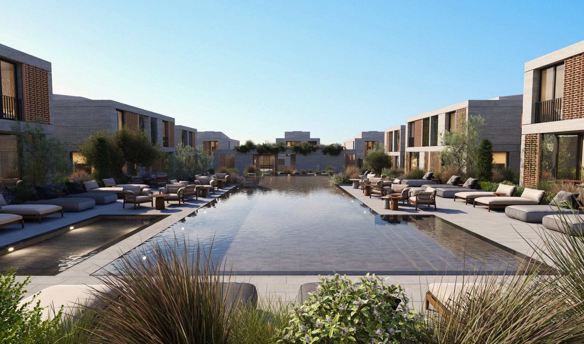 At its heart, the project offers a large swimming pool and a kids pool. The arrival experience is supported through a reception area, lobby, and sitting area, while the gym on the basement supports a balanced, active lifestyle.